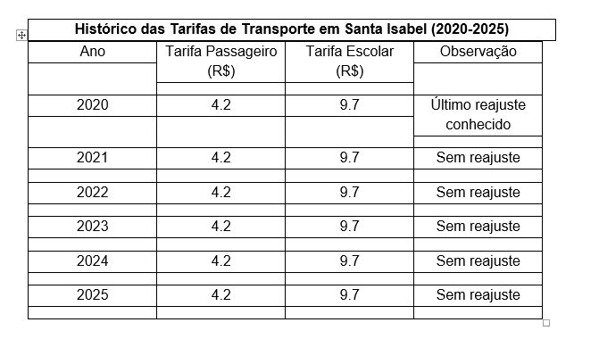 Na cidade de Santa Isabel, temos o orgulho de afirmar que trabalhamos há mais de 5 anos para oferecer um serviço de transporte de qualidade. O nosso projeto, conhecido como Tarifa Zero, se destaca como uma referência em todo o país, sendo rico e completo. Contamos com uma frota de veículos novos, garantindo conforto e segurança para todos os passageiros.